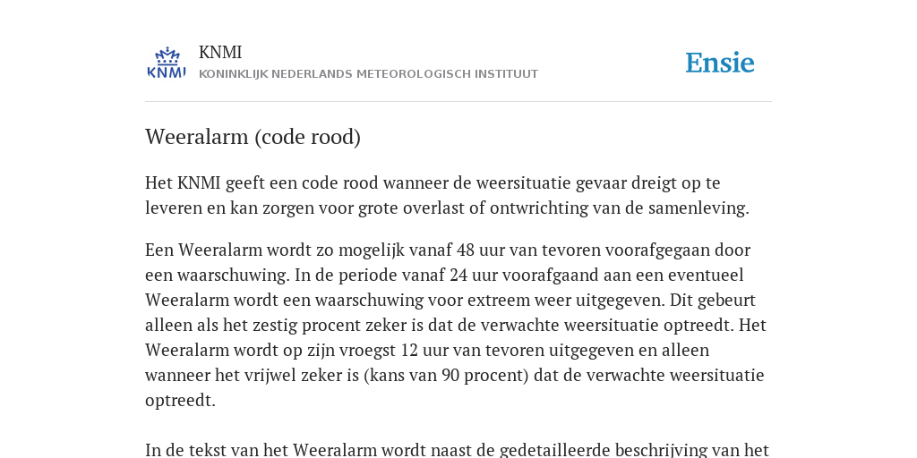Waarschuwingen voor code oranje en code rood worden door @knmi getwitterd en verschijnen op nos teletekst (pagina 713).