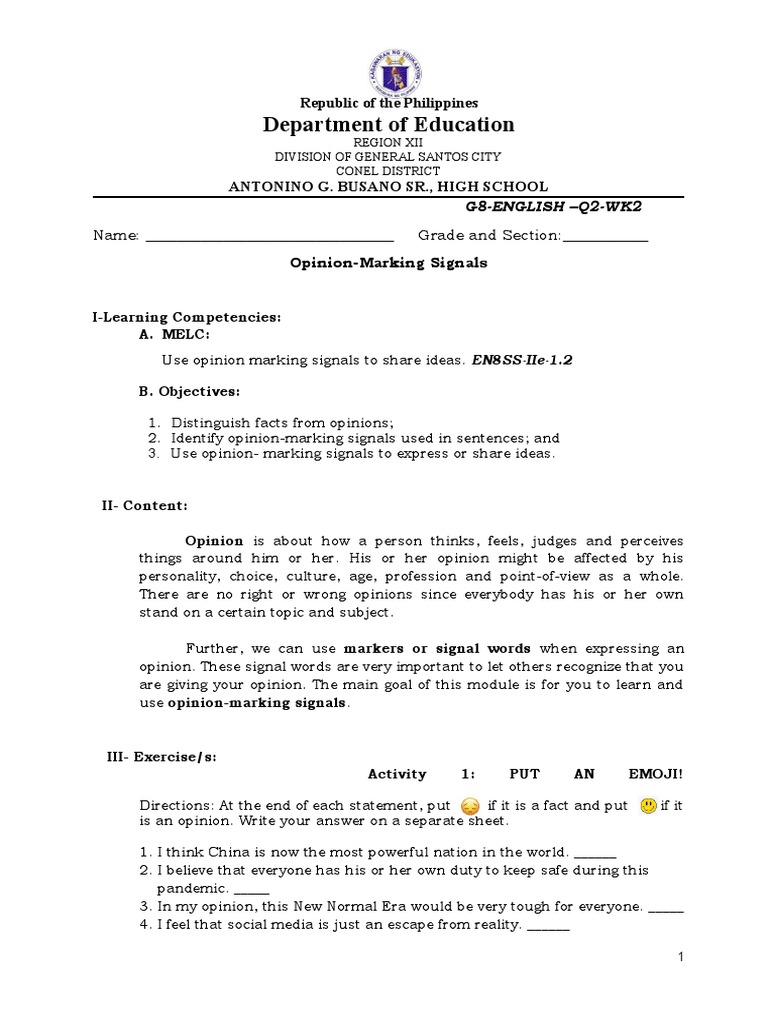 Opinion marking signals online worksheet for grade 8. Can anyone give examples for opinion marking signals? There is a wide variety of worksheets available so t. Eyes are used for sight, ears are used for hearing, and nose is used for smelling. English 8 quarter 2 week 2: